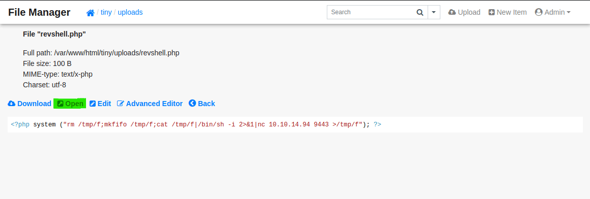 Now we can navigate to revshell.php on tinyfilemanager and click open: