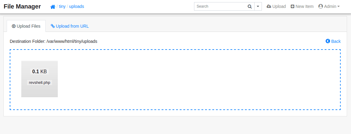 Next, we'll need to upload the payload, making sure the destination folder is /var/www/html/tiny/uploads as this is where we have permission to upload: